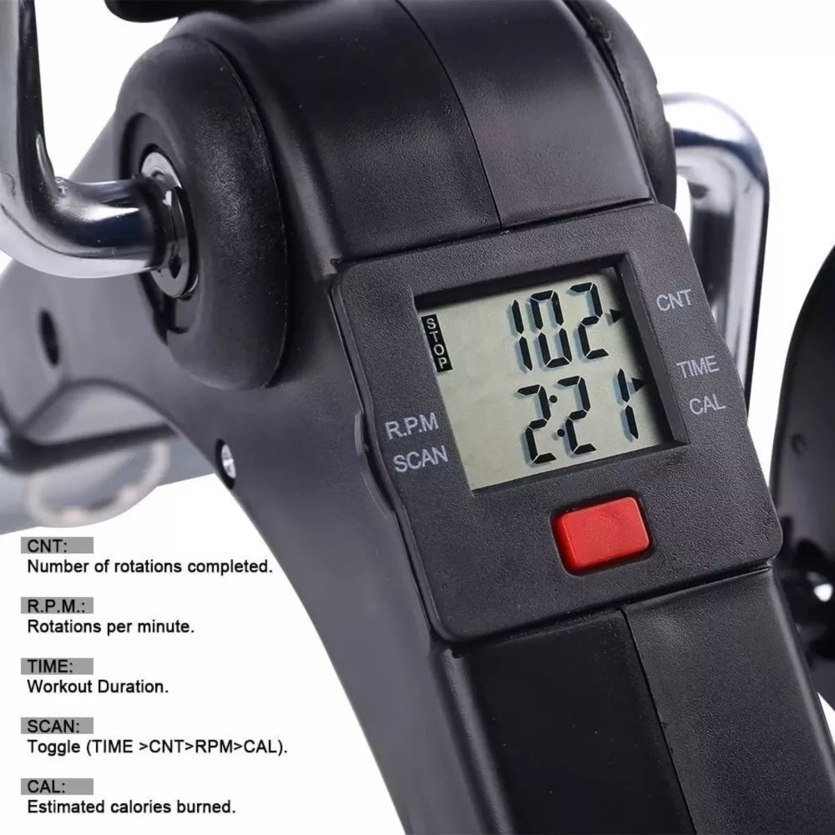 ESPECIFICACIONES Con dimensiones de ancho 38.5 cm, alto 24 cm y largo 53 cmPeso del producto de solo 2,2 kg,Soporta hasta 110 kg y sus correas ajustables se adaptan a diferentes tamaños de piePantalla para monitorear tiempo, distancia, calorias quemadas, y velocidad.  ¡Transforma tu rutina hoy mismo con nuestra Mini Bicicleta Estática de Pedales!